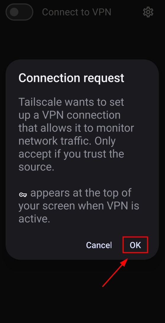 When Android shows the “Connection request” prompt, tap OK to let Tailscale create a VPN connection.