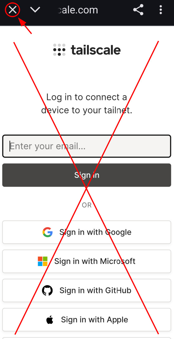 If a web page opens asking you to Sign in with Google/Microsoft/GitHub, do not sign in. Tap the close/X and return to the app — we use an auth key, not SSO.