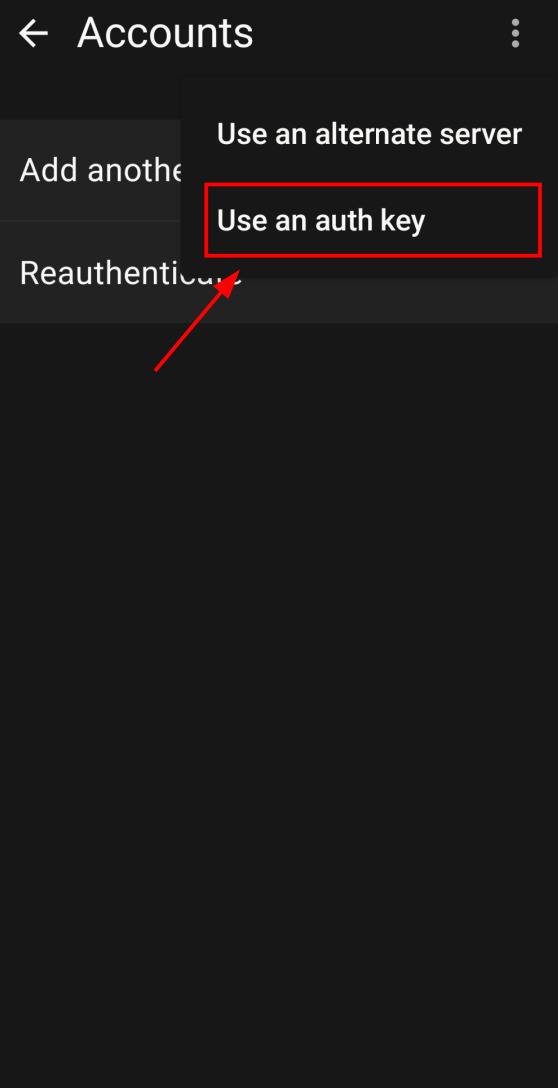 From the menu, select Use an auth key (it may appear beneath Use an alternate server).