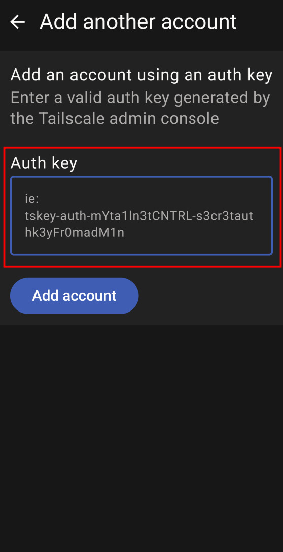 Screenshot: “Auth key” field and “Add account” button highlighted.